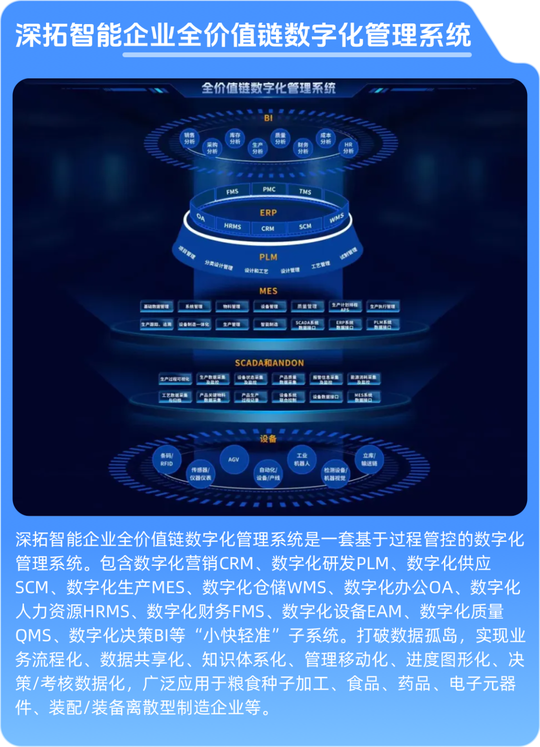深拓智能《全要素全價值鏈數(shù)字化管理系統(tǒng)》是一套基于過程管控的數(shù)字化管理系統(tǒng),就像企業(yè)的“智慧大腦”,能精準(zhǔn)把控企業(yè)運營的每一個環(huán)節(jié)。該系統(tǒng)包含12個“小快輕準(zhǔn)”子系統(tǒng),全面覆蓋研產(chǎn)供銷服管等企業(yè)運營全過程。各子系統(tǒng)之間協(xié)同高效、數(shù)據(jù)互通,打破了傳統(tǒng)企業(yè)中的數(shù)據(jù)孤島現(xiàn)象。